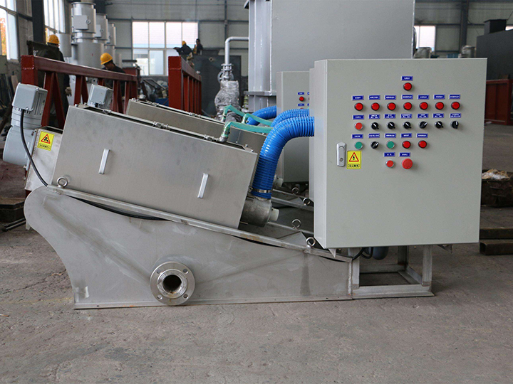 經(jīng)過(guò)濃縮的污泥隨著螺旋軸的轉(zhuǎn)動(dòng)不斷往前移動(dòng);沿泥餅出口方向,螺旋軸的螺距逐漸變小,環(huán)與環(huán)之間的間隙也逐漸變小,螺旋腔的體積不斷收縮;在出口處背壓板的作用下,內(nèi)壓逐漸增強(qiáng),在螺旋推動(dòng)軸依次連續(xù)運(yùn)轉(zhuǎn)推動(dòng)下,污泥中的水分受擠壓排出,濾餅含固量不斷升高,實(shí)現(xiàn)污泥的連續(xù)脫水。